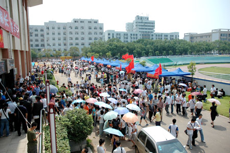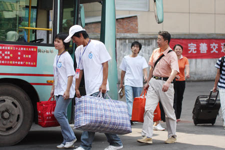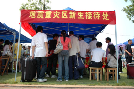 记者在第一体育馆前坪迎新处看到,迎新工作如火如荼,到处都是忙碌的身影。各学院的学生志愿者引领着新生和家长穿梭在各个手续办理点,不厌其烦地回答着他们提出的各种问题。不少老生们主动帮着拎行李,一路谈笑风生。新生细声地叫着“学长学姐”,老生们开心地介绍这介绍那。在地震重灾区新生接待处,工作人员耐心、细致地给新生解释和办理绿色通道和助学贷款等事宜。卧具、购餐卡、军训服的领取点,人头攒动,秩序井然。