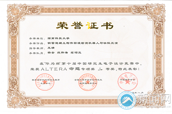 我校“信息队”经过三个月的准备,完成名为“钢管混凝土构件回波检测机器人与缺陷反演”的参赛作品。本作品是针对钢管混凝土构件内部缺陷的检测和反演而设计,主要由检测机器人和上位机软件组成。检测机器人对钢管混凝土构件进行自动扫描式冲击回波检测,将检测数据通过无线方式实时传输至上位机,并由上位机软件解析反演出被测钢管混凝土内部缺陷。通过对预制缺陷的钢管混凝土模型进行试验验证,检测机器人运行正常,检测结果准确。7月,我校参赛作品展现实力,突破多重挑战,荣获华中赛区一等奖,成功入围研电赛全国总决赛,同时获得了Altera企业命题全国二等奖。“信息队”由信息与电气工程学院王靖任指导老师。研究生工作部副部(院)长胡斌粱和研究生工作办公室主任杨骐玮亲自带队参加比赛。