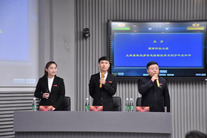 冠亚军争夺赛上,我校(反方)对战东道主湖南大学(正方),围绕“土耳其埃尔多安总统制改革是否有利于中东和平”展开唇枪舌战。我校曾玉云(一辩)、陈鹏(二辩)、赵曜(三辩)三位辩手面对东道主的恢宏气势,毫不示弱,开篇立论紧扣主题,提出“埃尔多安总统制改革的根本目的是对内集权,对外扩张”。湖南大学辩手举出PP板,列举美国三权分立制度,从实证角度阐释“埃尔多安总统制是三权分立的表现”。