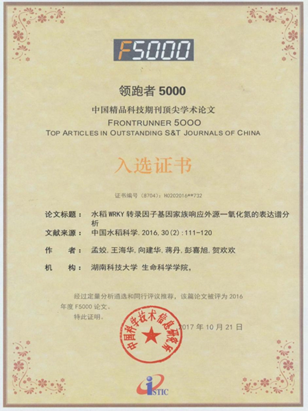 近日,国家科技部中国科学技术信息研究所(简称中信所)公布了2016年度“领跑者5000—中国精品科技期刊顶尖学术论文(F5000)” 入选名单。以我校生命科学学院王海华教授为通讯作者,孟姣、王海华、向建华、蒋丹、彭喜旭、贺欢欢共同完成的论文“水稻WRKY转录因子基因家族响应外源一氧化氮的表达谱分析”入选,该论文发表在2016年度的《中国水稻科学》(第30卷第2期)上。