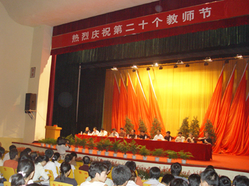 校长田银华随后发表了讲话。他代表校党委、行政向辛勤耕耘在学校各个岗位上的全体教职员工和全体离退休教师致以节日的问候和崇高的敬意,同时对他们在学校发展建设中发挥的重要作用予以充分肯定。他说,教师是人类灵魂的工程师,教师的职业崇高而神圣。多年以来,我校涌现出了一大批倾尽爱心、精心育人、教育教学成果显著的普通教师和忠于职守、勇于开拓、乐于奉献的教育管理者和服务工作者,也正是有了这样一支爱岗敬业、教书育人的优秀教职员工队伍和这样一种教育团队精神,我校的教育教学工作才会有今天的兴旺和辉煌。他强调,当前,我校实施了以全面提高教育教学质量为核心内容的教学迎评工程,这是一项尊重教师主体地位、发扬教师积极性和创造性的系统工程,为了做好这件工作,我们必须将教师的因素摆在第一位,努力营造尊师重教的氛围,为教师教书育人创造条件。他表示,我们将继续本着“以人为本”的理念,从完善教学管理、干部人事聘任和分配办法等制度上着手,不断完善制度,规范执行;从加大投入力度、改善条件上着手,努力为教师的教学、科研活动提供理想的场所、良好的设备和先进的资料。他还希望广大教育工作者:一是要树立为师的光荣感、爱校的责任感和兴校的使命感;二是要践行教书育人的真谛,努力培养在知识变革和社会进步中大有作为的大学生;三是要不断充实自己,完善自己,促进个人的全面发展。最后,他号召全校师生以庆祝第20个教师节为契机,以优秀教师为榜样,充分发扬主人翁精神,积极、主动、热情地投身于迎接本科教学工作水平评估和申报博士授权单位的工作中,为开创学校各项工作的新局面,实现学校的跨越式发展努力奋斗!