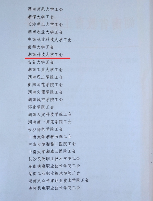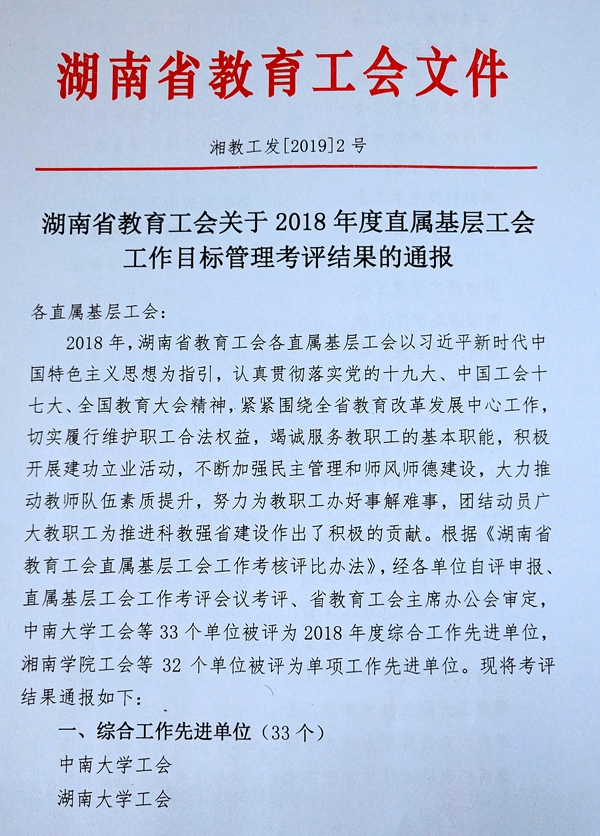 据悉,根据《湖南省教育工会直属基层工会工作考核评比办法》,经各单位自评申报、直属基层工会工作考评会议考评、省教育工会主席办公会审定,共有33个单位被评为2018年度综合先进单位,32个单位被评为单项工作先进单位。