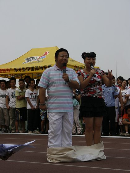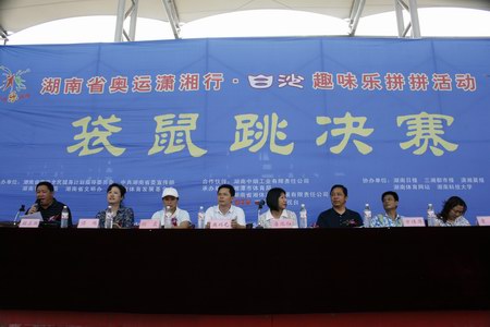 随着北京奥运会的临近,社会关注体育,喜迎奥运的热情不断高涨。为进一步营造浓郁的人文奥运氛围,推动全省全民健身运动的广泛开展。6月28日下午4点,湖南省“奥运潇湘行.(白沙)趣味乐拼拼”袋鼠跳决赛在我校新田径场火热上演。省体育局副局长、省体育发展基金会理事长、“奥运潇湘行.(白沙)趣味乐拼拼”组委会副主任唐久红,中共湘潭市常委、市委宣传部部长、本次比赛组委会主任周巧艺,省体育发展基金会秘书长谭欧,省体育局办公室主任曾伟,省体育局举重运动管理中心党总支书记杨霞,我校党委副书记宋元林,湘潭市体育局局长张立湘,我校体育学院院长申伟华,出席了本次活动。我省著名笑星刘澳、何晶晶担任主持人。
