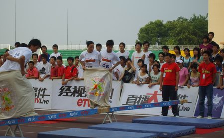 本次比赛分为预赛和决赛两个环节,共有30个代表队分为15组进行比赛,选手们以袋鼠跳的姿势通过独木桥、气球阵、水上独木桥最后到达终点。经过预赛的激烈角逐共有八对选手脱颖而出晋级决赛。在之后进行的决赛中组委会为了增加比赛难度在水上独木桥上增加了踩气球环节。最终来自湘潭的选手凭借默契的配合以31“31的成绩夺得冠军,亚军和季军则分别被来自邵阳和湘潭的选手夺得,来自加纳的留学生也兴致盎然的参加了比赛并凭借一曲《甜蜜蜜》荣获鼓励奖。在赛后的颁奖仪式中,冠军队除了获得证书和奖金外还收获了一张由奥运冠军杨霞颁发的北京奥运会门票。在我校活动现场,师生齐为选手呐喊助威,气氛十分浓厚,赛场上充满趣味。