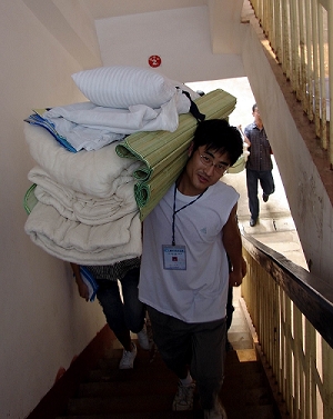 7日上午,南校区图书馆前热闹非凡,来自五湖四海的新生在学长学姐的带领下忙着注册、报名、领卧具、找寝室。“科大的学长、学姐好热情,把我们的一切都安排的十分妥当,让我有一种回到家的感觉,真的十分感谢他们。”一位来自江苏的新生跟我们说到。迎新工作总服务台的负责同学跟我们说:“帮助新生是我们作为学长学姐义不容辞的责任,在我们作为新生时,也曾经得到了许多学长学姐的帮助,现在我们只是继承这种光荣传统。”