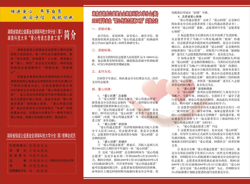 据悉,湖南省铭成公益基金会是由原富士康科技集团员工发起创办,是一种社会公益性组织。它计划在我校2007届毕业生中首次实施“爱心传递志愿者工程”(本次仅是试点,以后将扩大规模并开始面向在校学子),旨在使莘莘学子既可得到爱心资助又志愿进行爱心传递。基金分会资助对象为品学优良、家庭困难、富有爱心、诚实守信、需要获得资助并志愿成为“爱心传递志愿者”的我校2007届毕业生。每位志愿者将获得人民币一仟元的资助,如有特殊原因,经申请审批后可相应增减金额。当志愿者与基金分会双方的合同签字生效后,基金分会将资助金以现金方式一次性支付给志愿者,志愿者则需按相关规定,在指定的时间段内向基金会进行“爱心回馈”。