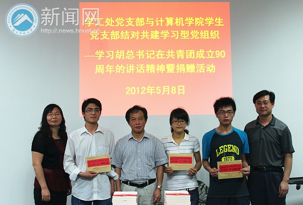 5月8日下午,我校学工处党支部与计算机学院党支部结对共建学习型党组织——学习胡总书记在共青团成立90周年的讲话精神暨捐赠活动在逸夫楼210会议室举行。学工处、计算机学院相关负责人与会,同16名计算机学院的学生代表亲切交流。