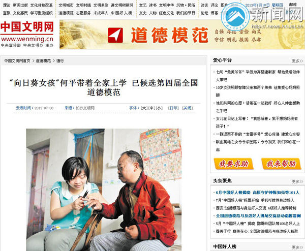 根据有关安排,第四届全国道德模范评选网络投票今日启动,投票时间持续一个月。大家可登录中国文明网,按照投票规则积极参与投票。在本次全国道德模范评选确定的318名候选人中,湖南省共有10位候选人,我校何平同学位列其中(序号为517号,点击左侧孝老爱亲模范)。投票通道网址为: