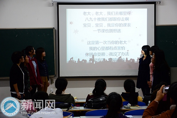 11月20日,502寝室的全体同学在13级新闻系的团组织生活会上首次向大家演唱了《老大去哪儿》,并把歌词以PPT的形式展示出来,熟悉的旋律,温暖的歌词,当场引得大家一起合唱。11级人文学院小杨听完后感慨:“既有创意又很温暖,以前总觉得团组织生活会枯燥无趣,现在看来那只是因为我们没有用心去组织和感受啊。”502寝室丁婉婷说,希望能以这种方式让团组织生活会变得生动有趣,也希望寝室的这份温暖能够感染大家,让更多的同学都把寝室当作自己大学里温暖的家,和室友相亲相爱、和谐相处。