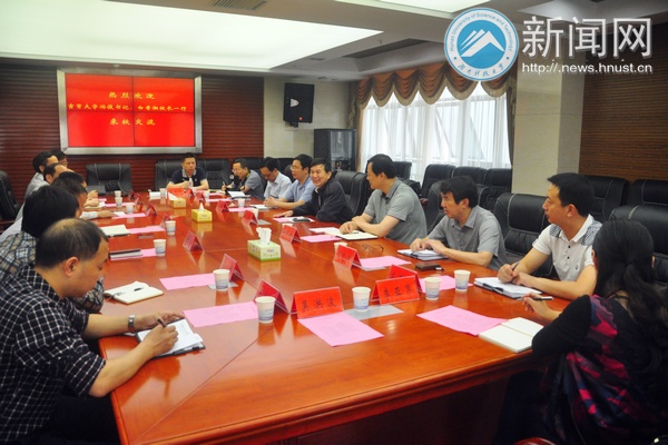 5月26日上午,吉首大学党委书记游俊、校长白晋湘一行来我校交流。校党委书记刘德顺、校长李伯超、副校长唐果宁及学校相关职能部门负责人在综合楼601会议室亲切会见,双方就“深化综合改革相关经验”进行经验交流与分享。