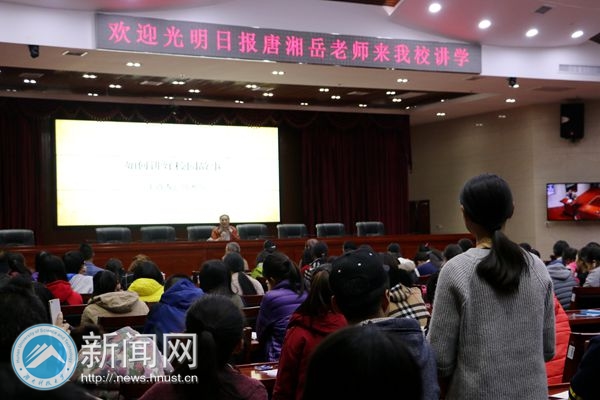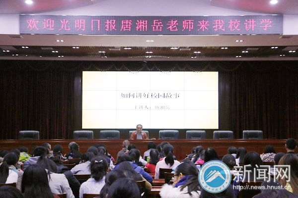 唐湘岳举出《雷锋故乡小雷锋》、《红旗的故事》等多篇大学生舍己救人的稿件,比较同一类型不同人物、同一人物同一事件如何通过不同角度写出不同的故事;借湖南师范大学九十年代招揽来大批贤才一事(稿件《何以引得凤凰来》)、湘潭大学学生胡志鹏的感人事迹(稿件《志鹏的翅膀》等系列报道),进一步讲述什么是有价值的校园故事。
