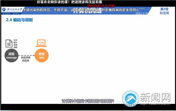 “神仙老师”“宝藏老师”“发现宝贝”“干货满满”“羡慕湖科大”“深入浅出”“爱了爱了!”……在《计算机网络》微课堂的视频评论区和弹幕里,这样的字眼频繁蹦出。《计算机网络》微课堂是我校信息与电气工程学院高军老师精心制作的在线视频课程,力求用简单的语言描述复杂的问题,用形象生动的动画演示抽象的概念,用精美的文案给人视觉的享受。