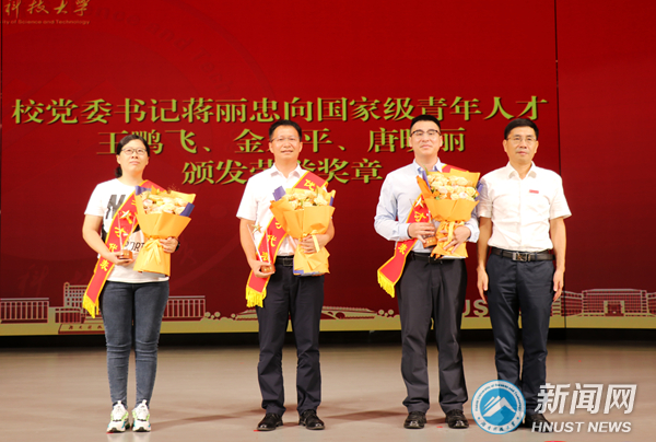 ▲蒋丽忠向国家级青年人才王鹏飞、金永平、唐晓丽颁发荣誉奖章