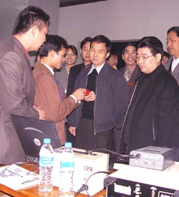 图为中国科学院院士刘友梅先生(中)、共青团湖南省委书记吴奇修(右二)、校党委副书记宋元林(二排右一)饶有兴致地观看特等奖获奖选手黄家厚演示作品《多芯重锁防盗锁头》。