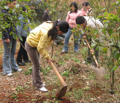 3月11日上午,我校建筑学院06级30多名志愿者在学院志愿团的带领下来到北校区小树林为去年植下的小树锄草施肥。