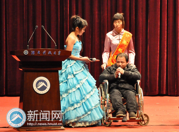 09级学生曾苏梦,同样在年幼时,被剥夺了双脚站立行走的权利,他终身只能与轮椅为伴。然而 ,生活的逆境并没有把曾苏梦打垮,2010 年,被评为院级优秀学生,并荣获2010年度湖南科技大学教育基金会“长沙校友资助金”,都证明着身体虽被命运抛弃,心灵却唱出强者的歌。“我知道自怨自艾是没有用的,我用微笑面对生活。”朴实的话语感动着我们。
