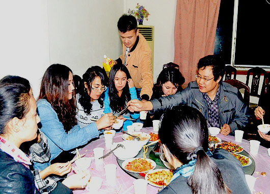老师学生一起举杯祝贺“古尔邦节快乐”,“大家要吃得尽兴呀。”餐桌上,向院长热情地为学生夹菜,关切地询问他们的近况。