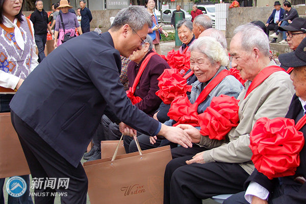 余伟健代表校党委向全体离退休教职工及“钻石婚”“金婚”夫妇致以崇高敬意和美好祝福。他感谢全体离退休教职工对学校的贡献,还赞扬“钻石婚”“金婚”伉俪用半个多世纪的相守诠释了爱与责任,为他们颁发专属礼品。