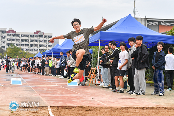 起步,助跑,跳跃,尘土飞扬,全场欢呼......夺下男子乙组桂冠的体育学院24级运动训练专业王文龙腾飞落地、身姿矫健,引得现场观众连连惊呼。14.363米的成绩,打破了我校三级跳远项目的记录,创造出新的辉煌篇章。提及比赛技巧,王文龙谦虚地说:“最重要的一点还是认真对待自己的每一次训练,跟着校队一起训练,谨听教练的指导。”业精于勤荒于嬉,日复一日扎实的训练才有了今天的成功。