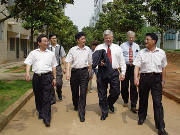 图为校党委书记肖国安、校长田银华亲切会见美国哈丁大学校长代表团一行。