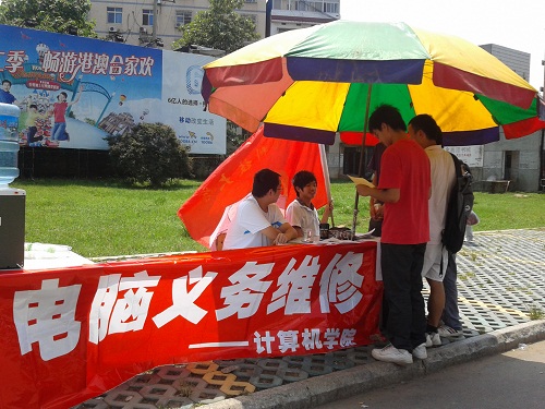 7月6日,计算机学院“三下乡”服务队技术组成员率先进入社区,在南校街设点进行了计算机的咨询与维护,同时也派达一批志愿者主动上居民家维修电脑。