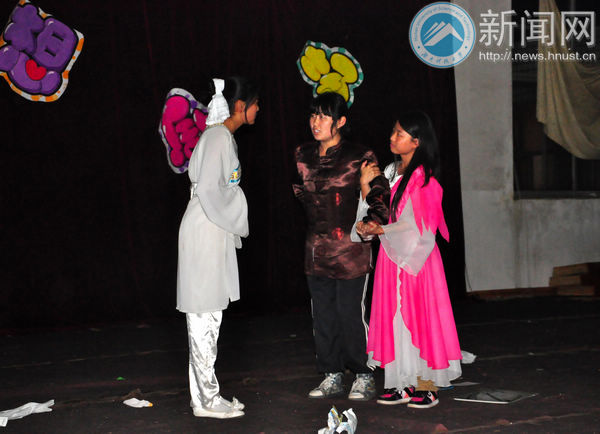 身着各色服装的演员们紧锣密鼓的排练着,热烈的气氛如同大赛青春洋溢的口号。对外一班的高嘉阳忘情地和伙伴们讨论着表演时的细节:注意表情、讲台词时声音要大、注意表演时的位置等等。反串男主角的沙沁池则“苦笑”着指着自己的腿说:“有一个‘别人’把我推倒的动作太入戏,我的腿‘华丽丽’的淤青了。”