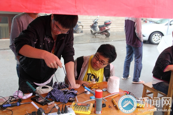 10点左右,第一单“生意”就上门了,建筑学院的刘林楚拿着他的犀牛小台灯来到维修点,工作人员询问出现什么问题,并登记留下电话和名字,方便及时通知。他们拆解并多次测量,最终得出“开路”的故障结论,然后两人合作,用电烙铁焊锡,焊接断路处。副会长黄国明在旁指导,并教他们交流技巧:“你们在告诉他们故障时,不要说是开路,而是直白的“线断了”,这样他们就比较容易理解”,“我觉得很开心呀,台灯那么快被修好,很感谢他们”,得到通知前来领取台灯的刘林楚说道。