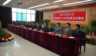 会上,专家组组长牛维麟代表专家组宣读了评估考察意见。他说,在考察期间,专家组认真审阅了《湖南科技大学本科教学工作水平评估自评报告》及支撑材料和原始档案;听取了田银华校长关于湖南科技大学本科教学工作情况的汇报;集体考察了学校图书馆、采矿工程实验室、现代化矿井模型室、力学实验室、结构实验室、基础物理实验室、电工电子实验室、外语语言教学实验中心、学生借阅中心、英语自主学习中心、陶艺和版画基础工作室、体育场馆等教学设施以及学生食堂、学生公寓等生活设施;分别走访了能源与安全工程学院等全部18个学院和教务处等15个相关职能部门;观看了大学生文艺演出;参观了师生艺术作品展,参加了升国旗仪式,查看了学生早操及早晚自习等;进行了6场技能测试,分别考查了101名学生的英语基本技能、车工操作技能、化学实验技能、单片机应用技能以及微格教学水平;召开了校领导、离退休同志、管理干部、教师、学生、校友等9个座谈会;听课38门,抽查了25门课程的1145份试卷,调阅了29个专业的783份毕业论文(设计)及6个专业的103份实验(实习)报告,还调阅了学校近年的财务决算报告、体育工作及运动会的相关文件和材料。专家组认为:湖南科技大学高度重视本科教学工作水平评估,认真贯彻“以评促改、以评促建、以评促管、评建结合、重在建设”的方针,加强领导,周密部署,精心组织,全面建设。通过以评促建,加快了合并融合和发展的进程,学校办学条件和办学水平上了一个新台阶,本科教育教学状况、师生的精神面貌和校园环境焕然一新,呈现出一派“人心齐、人气旺、事业兴”的新气象,给专家组留下了深刻的印象。